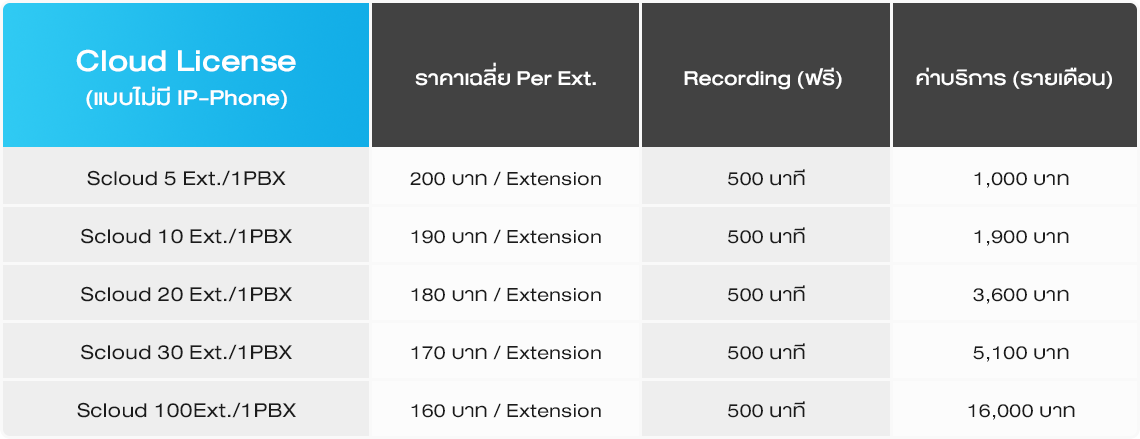 ระบบคลาวด์โฟน (Cloud Phone) ที่จะไม่ทำให้พลาดทุกสายการติดต่อกับลูกค้าเสมือนอยู่ในสำนักงาน มีรายการโทรเข้า โทรออก ไม่ได้รับสาย สามารถใช้ร่วมกับเบอร์พื้นฐาน ใน 1 สิทธิ์การใช้งาน (License) เชื่อมต่อได้ถึง 3 อุปกรณ์ (Device) รองรับทุกโครงข่ายสัญญาณโทรศัพท์
